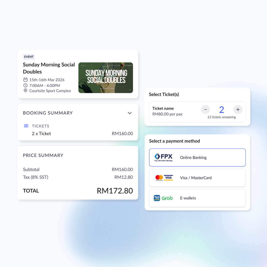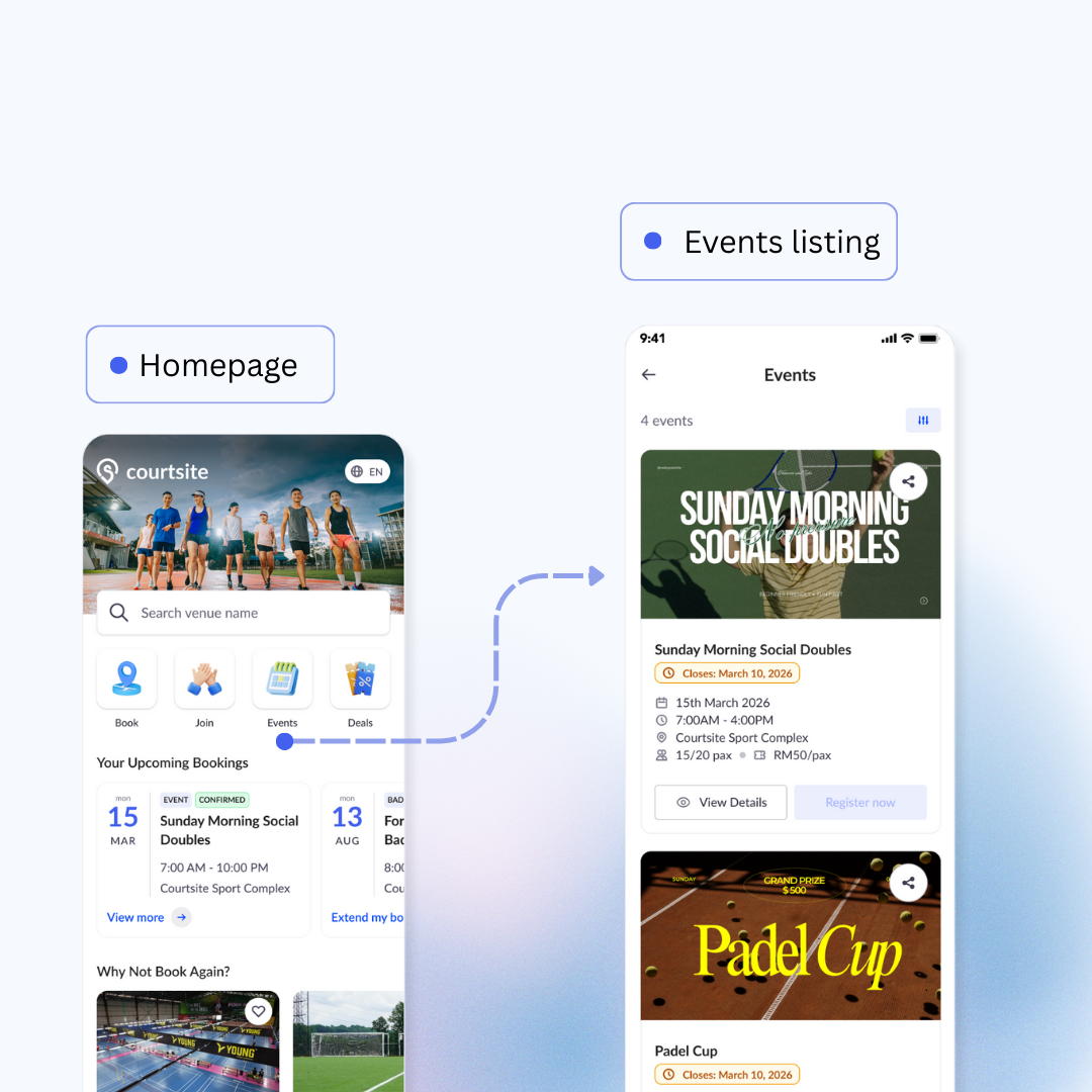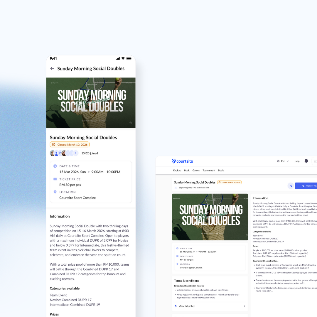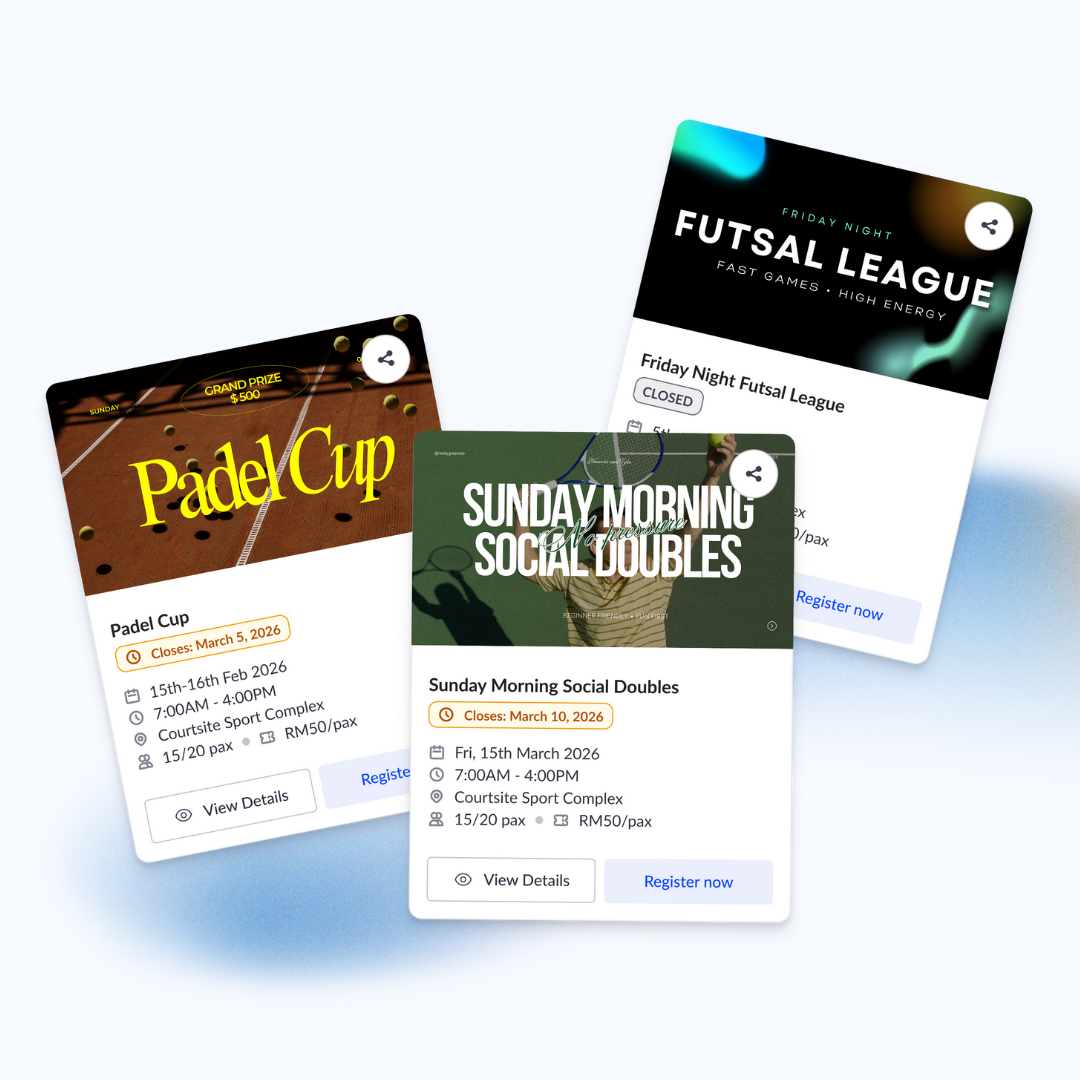 Sports venues across Malaysia are already using Courtsite to simplify court bookings. But now, there’s something even more powerful: the Event Feature—built to help you host one-time events (like festive matches, social games, or themed nights) directly on the platform, where thousands of active players can discover them, register, and pay on the spot.